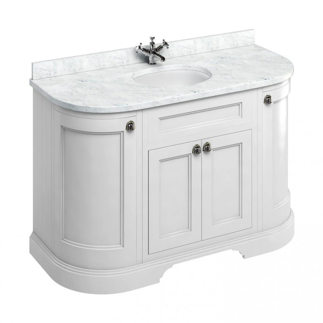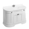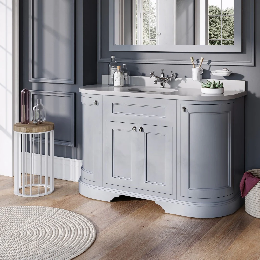 This elegant Burlington 1340 curved vanity unit gives you the traditional feel in a totally freestanding unit. If space is not an issue this unit provides wide opening doors for easy access and maximises storage. The piece combines a worktop on the unit with beautifully integrated basin and 4 soft close doors.