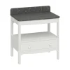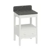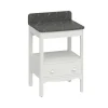This floorstanding vanity unit includes a single soft close drawer with pull handles, as well as an open central storage area that is perfect for storing towels. The solid surface carrara marble effect worktop offers both extra storage and a suitable surface for a countertop basin and tap, adding a touch of elegance to the unit’s overall design.