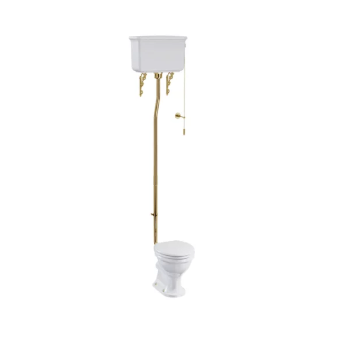This high level toilet includes flush pipe kit including lever, rigid pull chain, flush pipes, reverse screw cistern connector, stopper and ornate brackets, and comes in a gold, brushed nickel or finishes.