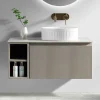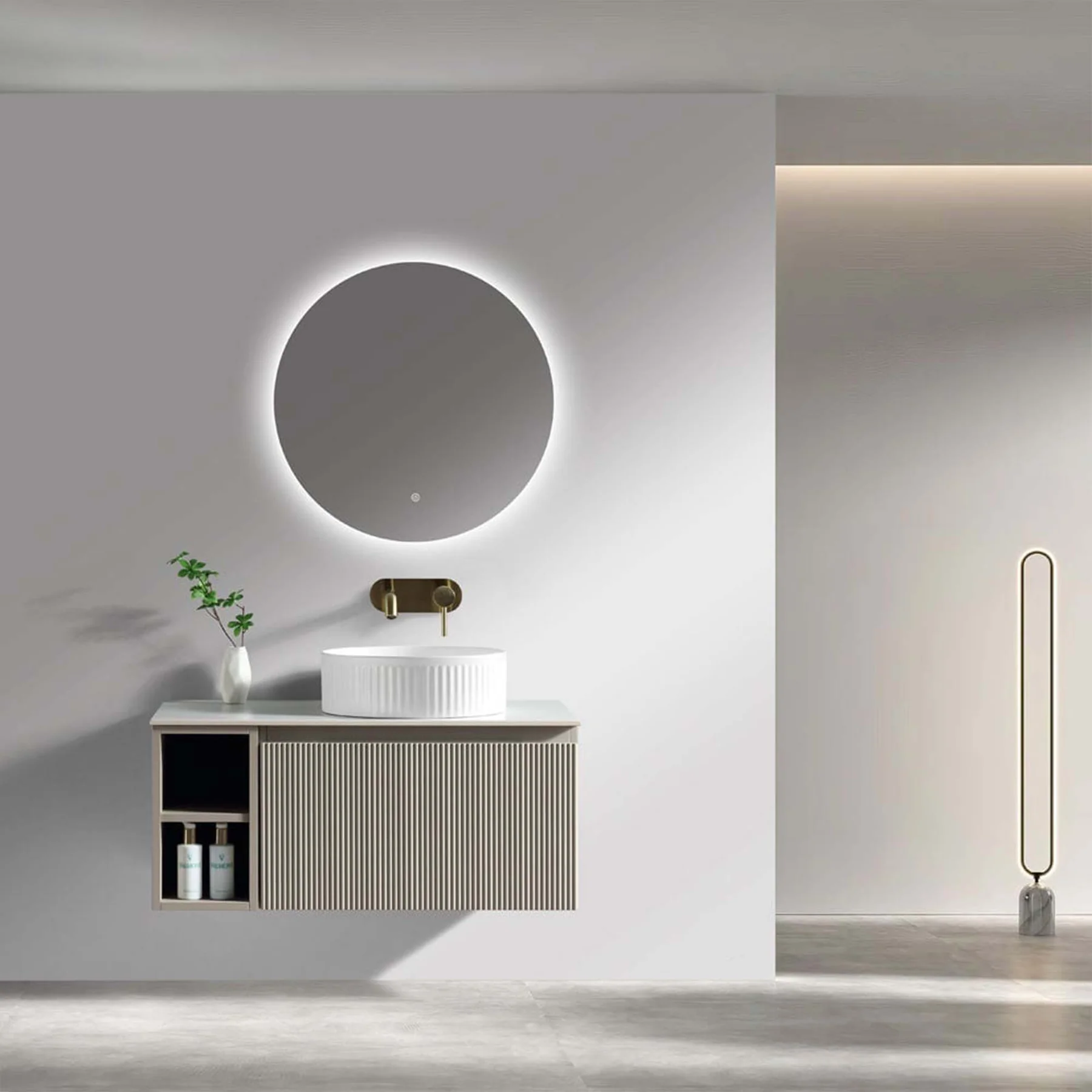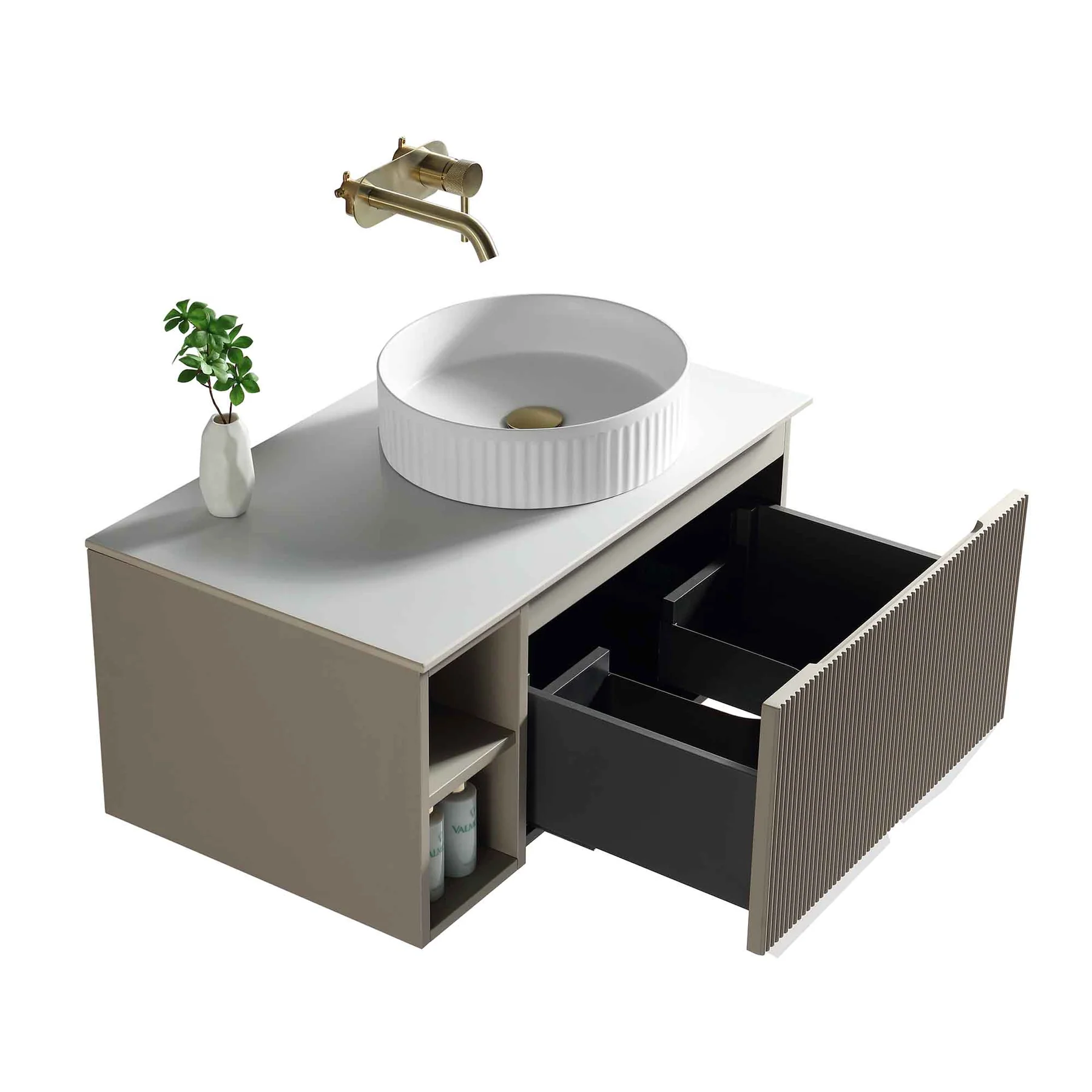 Flauto Fluted 800mm Wall Mounted Single Drawer Vanity Unit With Sintered Stone Worktop and Open Side Shelves – Soft Coffee