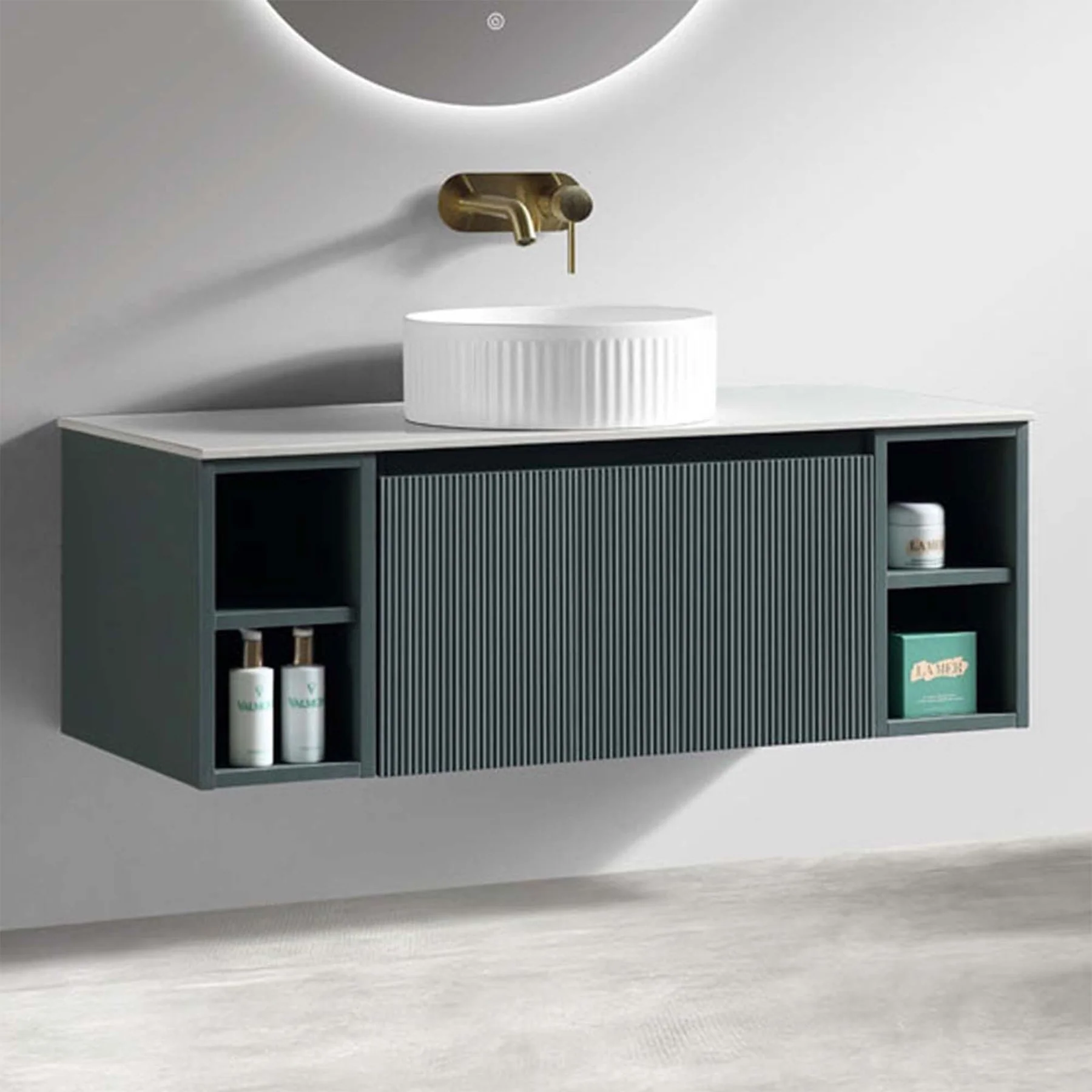 Florence Fluted 1000mm Wall Mounted Single Drawer Vanity Unit With Sintered Stone Worktop and 2 Open Side Shelves – Smoked Sage