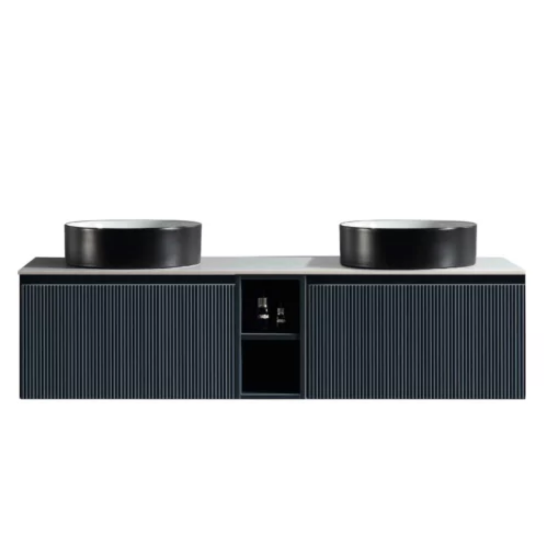 Florence Fluted 1400mm Wall Mounted 2 Drawer Double Vanity Unit With Sintered Stone Worktop and Central Open Shelf – Midnight Shadow