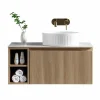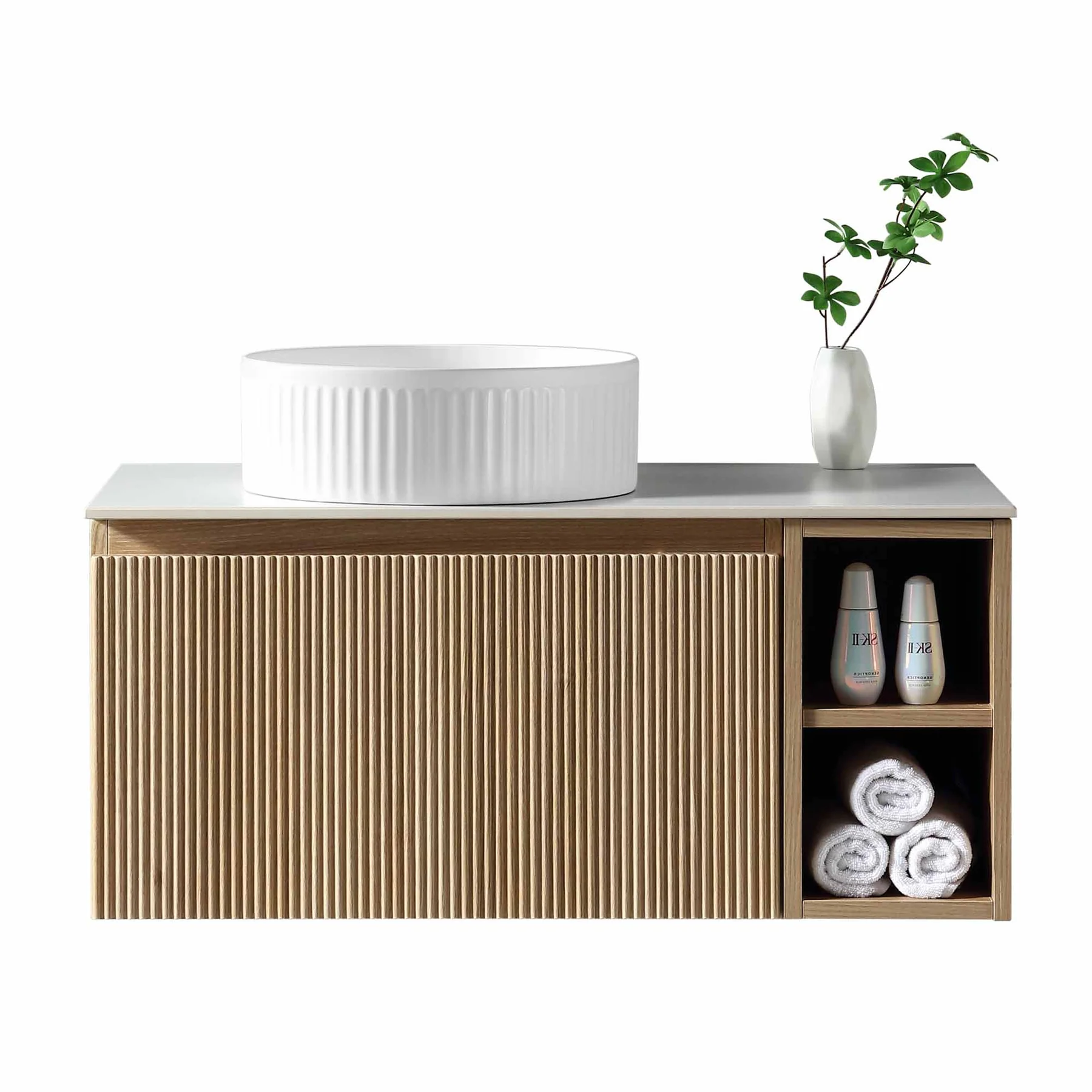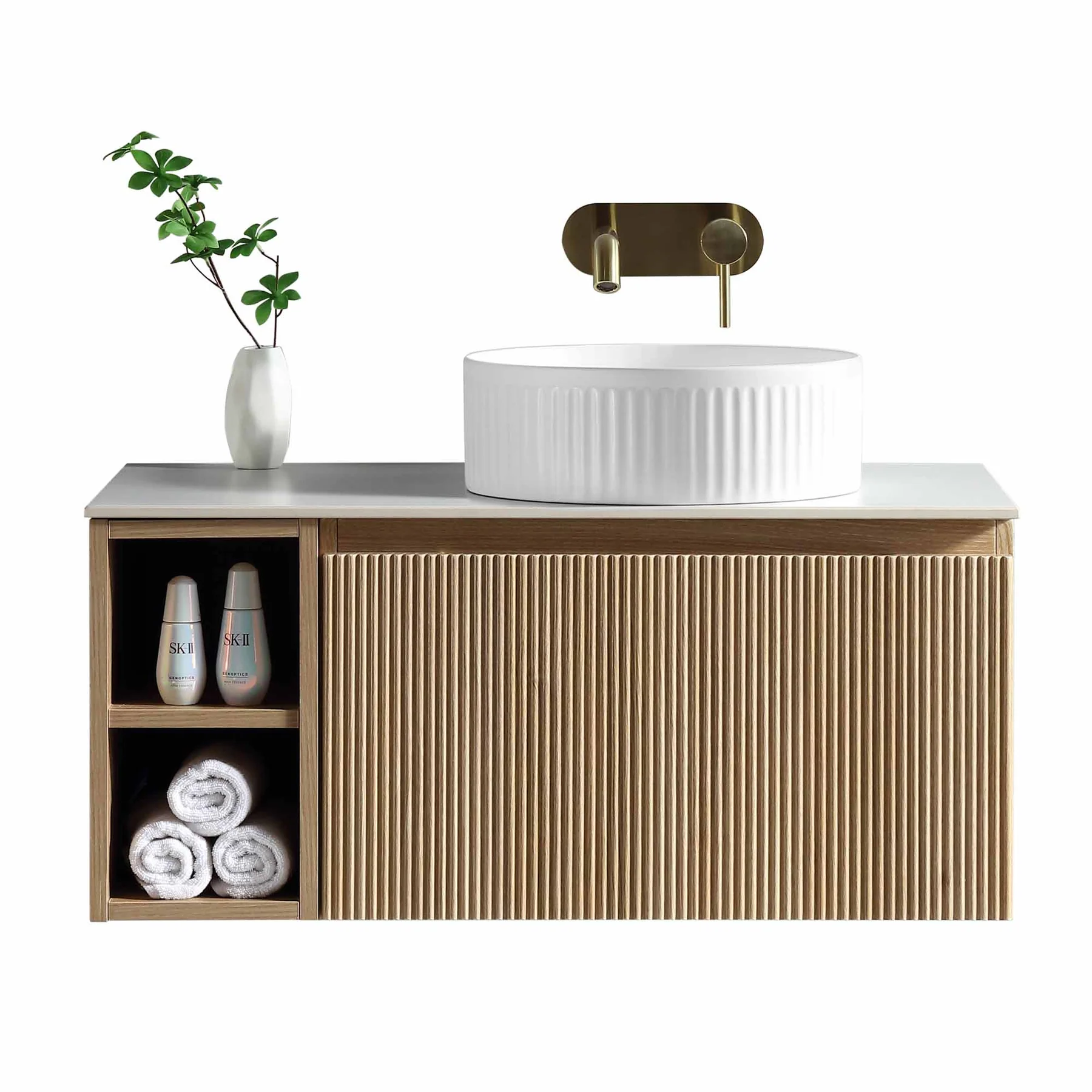 Florence Fluted 800mm Wall Mounted Single Drawer Vanity Unit With Sintered Stone Worktop and Open Side Shelves – Country Oak