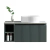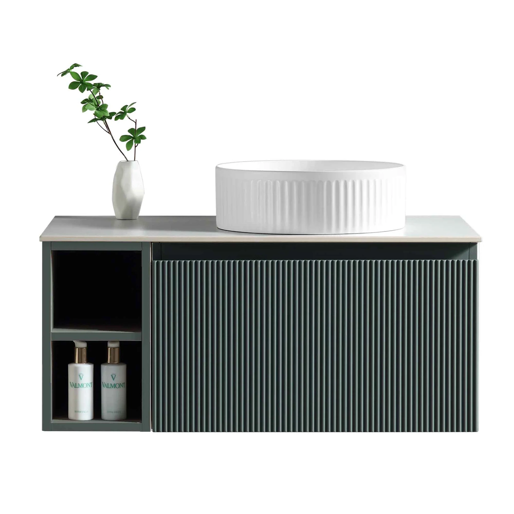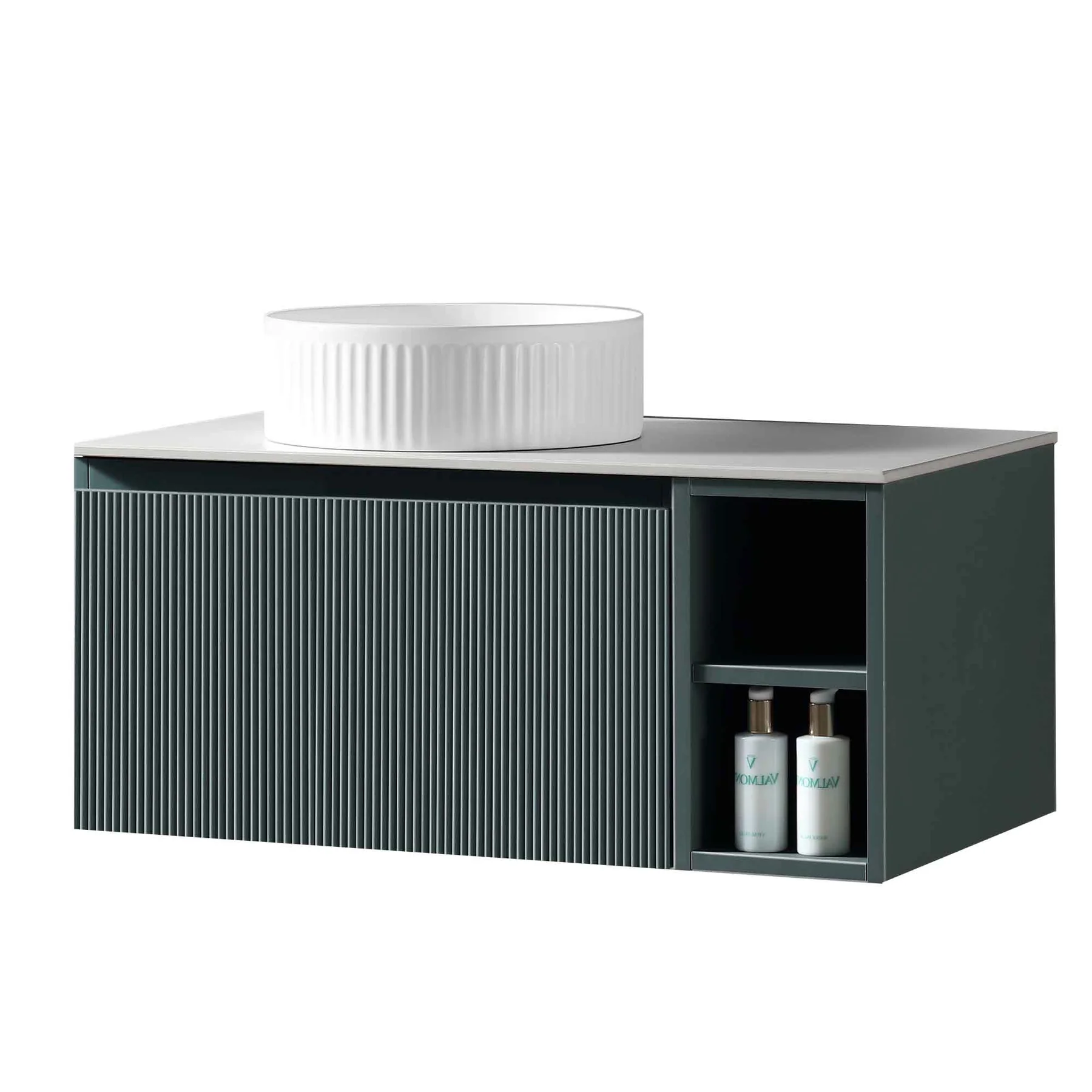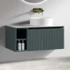 Florence Fluted 800mm Wall Mounted Single Drawer Vanity Unit With Sintered Stone Worktop and Open Side Shelves – Smoked Sage