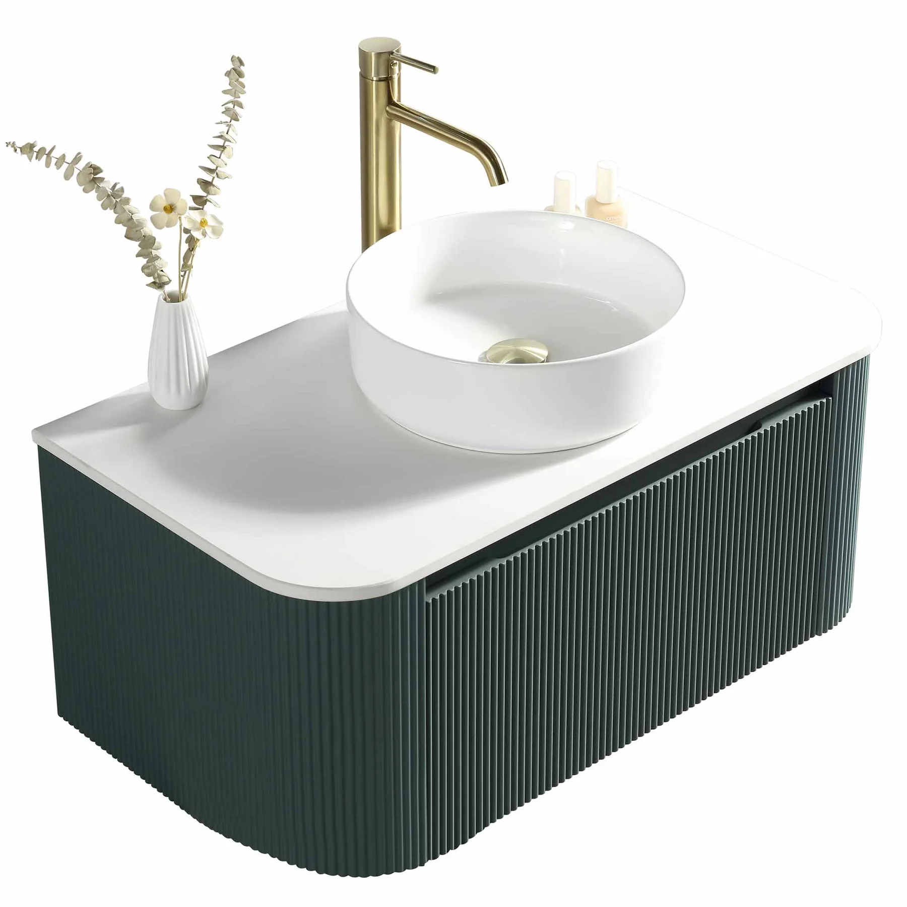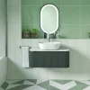 Featuring a single soft-close drawer with integrated handle, the Florence vanity offers generous storage capacity for all your bathroom accessories. Its curved shape gives it an elegant stature and draws the eye with it’s deep green smoked sage finish adding a sleek aesthetic to your bathroom decor.