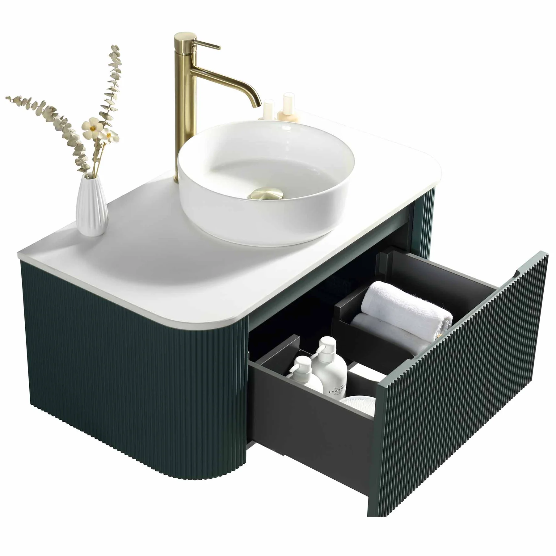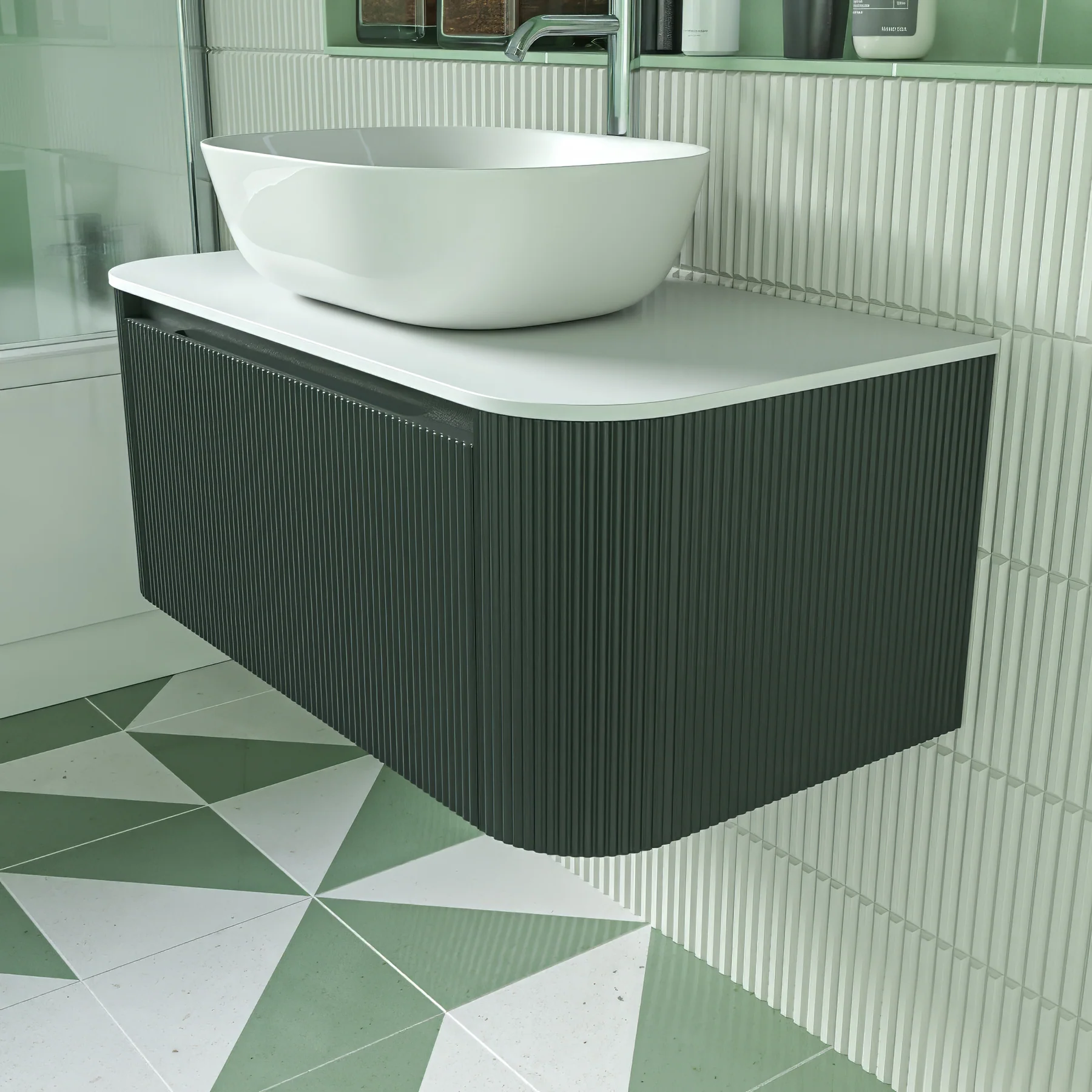 Florence Fluted 870mm Curved Wall Mounted Single Drawer Vanity Unit With Sintered Stone Worktop – Smoked Sage