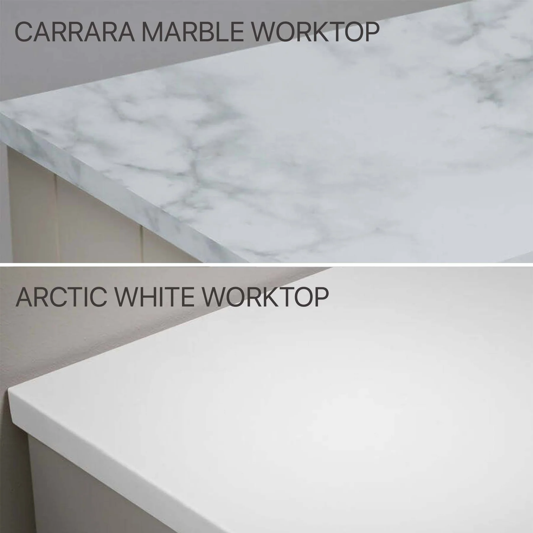 Complete with underslung basin with a choice of carrara marble or arctic white worktop, offering additional storage space and ideal for placing a basin mixer or wall mounted tap.