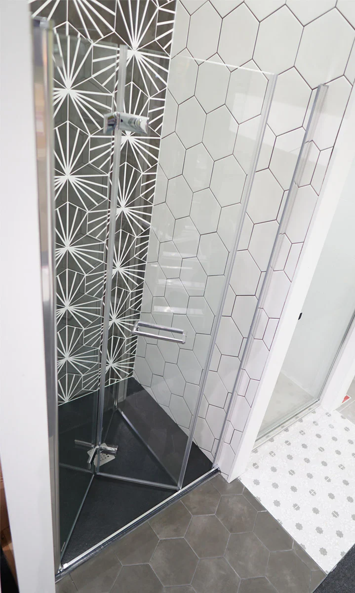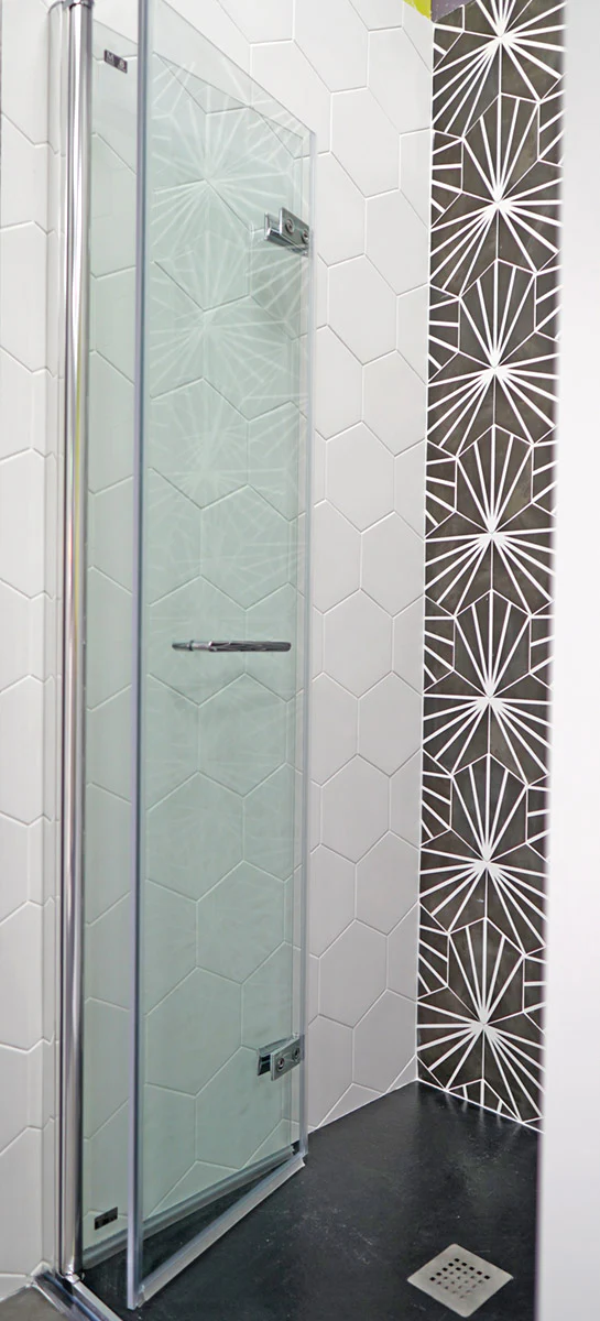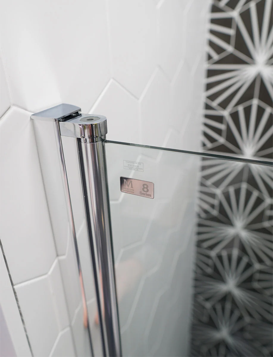 The MERLYN 8 Series Frameless Hinged Bifold shower door with a side panel is an ingenious space saving solution for bathrooms with space restrictions – the hero of the bijou bathroom. Folding away neatly and horizontally flush to the wall, this screen allows you to double your feeling of space in any small bathroom, giving you that extra elbow room you desire.